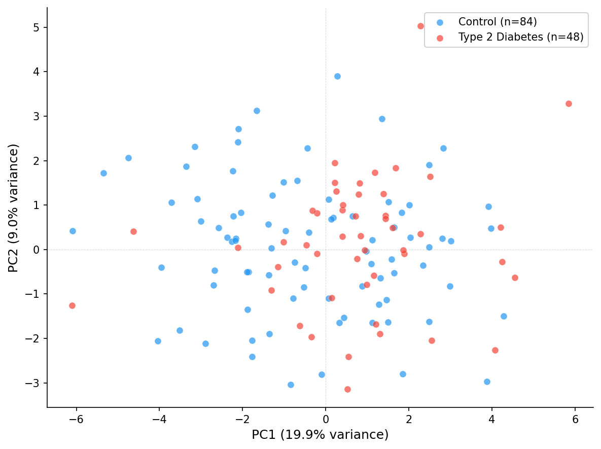Only 2.2% of values required imputation, and all 220 metabolites passed the 80% prevalence filter, indicating high data quality. PCA revealed moderate separation between diabetes and control groups (28.9% variance in first two components), consistent with the known metabolic perturbations in type 2 diabetes urine profiles.
